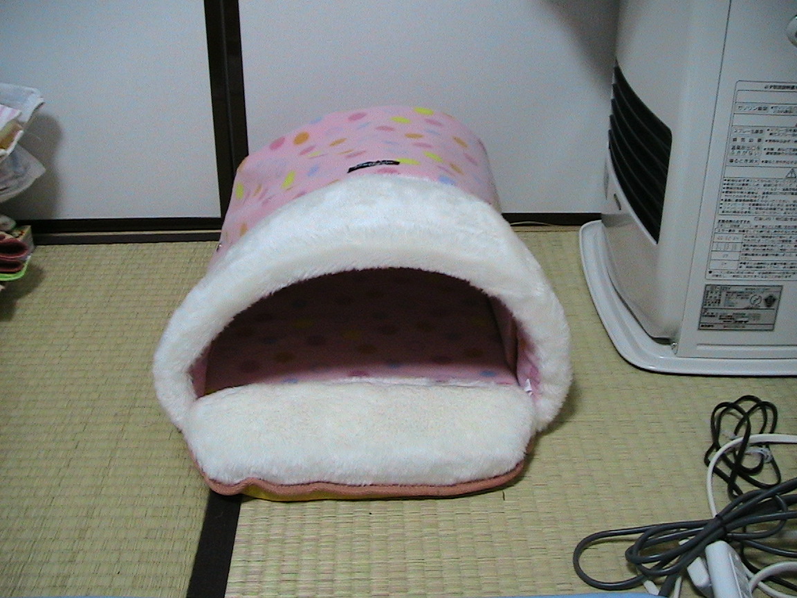 フリースのベッドだよ。電気ナシでほんわかあったか~い…んだけど、さすがにまだちょっと早いような気がしない?