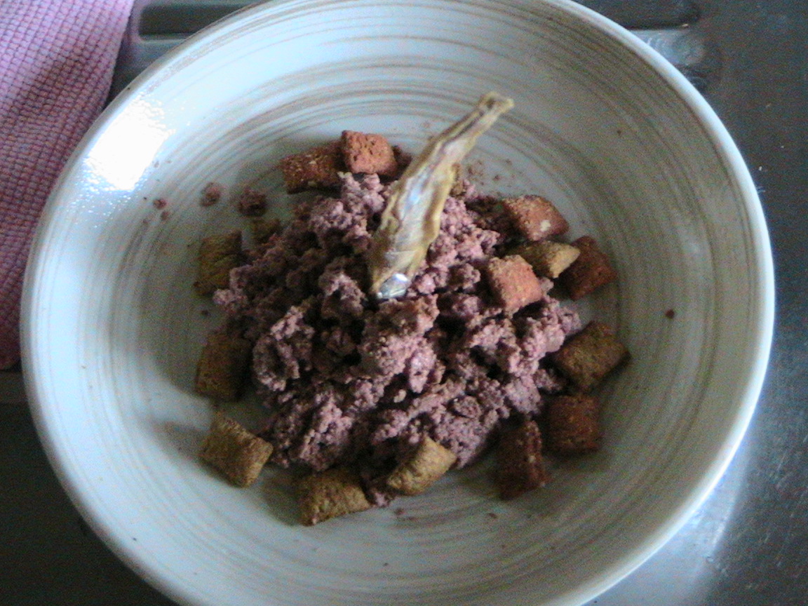 モンプチをメインに、周囲にシーバをちりばめ、(見えないけど)またたびがふんだんにトッピングされ、てっぺんにはローソク代わりのワカサギを挿した、ネコのボクにとっては夢のような、ぜいたくなゴハンです(*´ー`*)