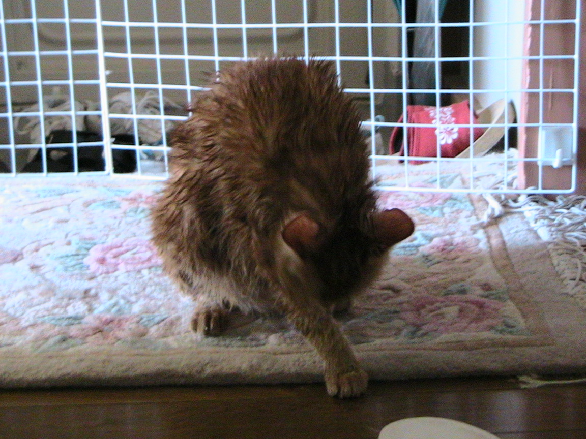 シャンプーはボクも大変だったけど、ツメ全開のボクによじ登られたおかあさんも、傷だらけで大変そうでした。おかあさんも「シャンプーはもうコリゴリ」って思ってくれればイイけど…。